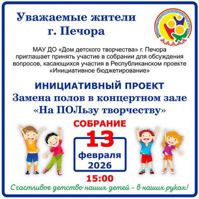 МАУ ДО "Дом детского Творчества" г. Печора в 2026 г. участвует в Республиканском проекте "Инициативное бюджетирование" - "Замена полов в концертном зале "На ПОЛьзу творчества". Счастливое детство наших детей - в наших руках! Спасибо ВСЕМ кто принял участие в предварительном этапе Народного проекта!